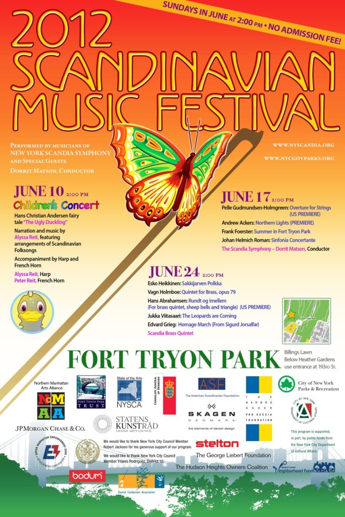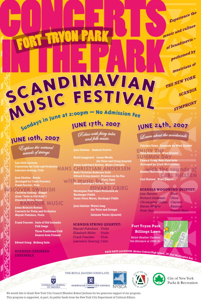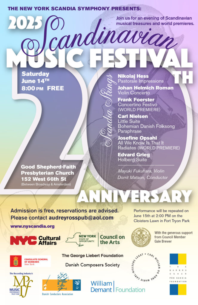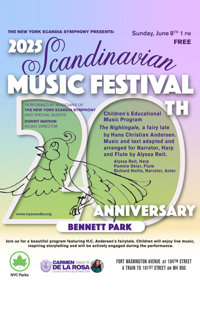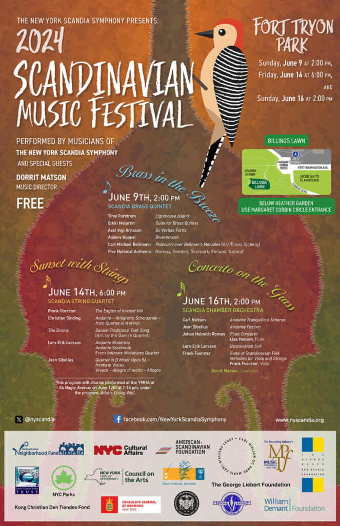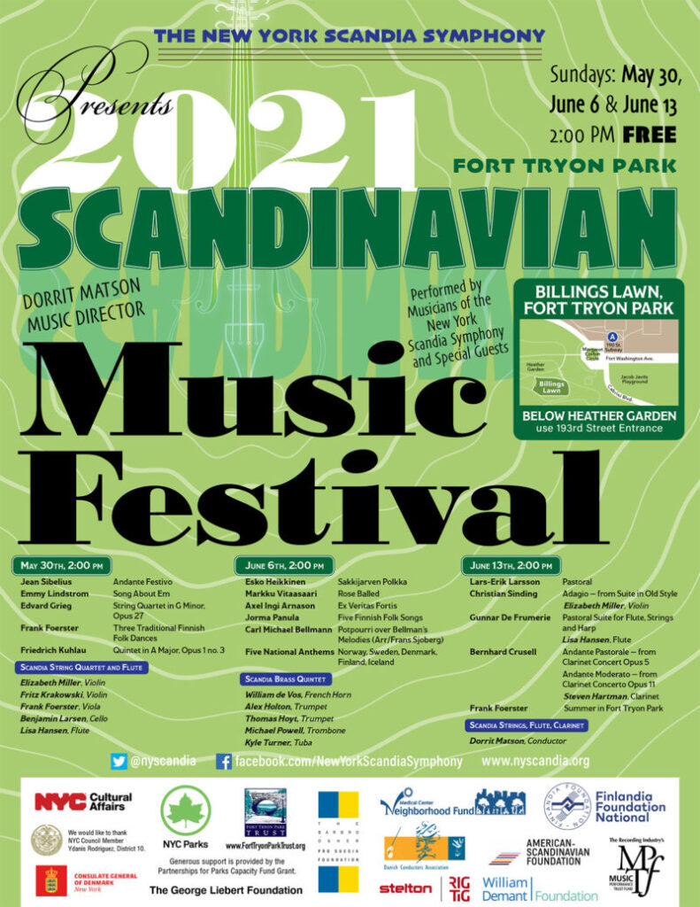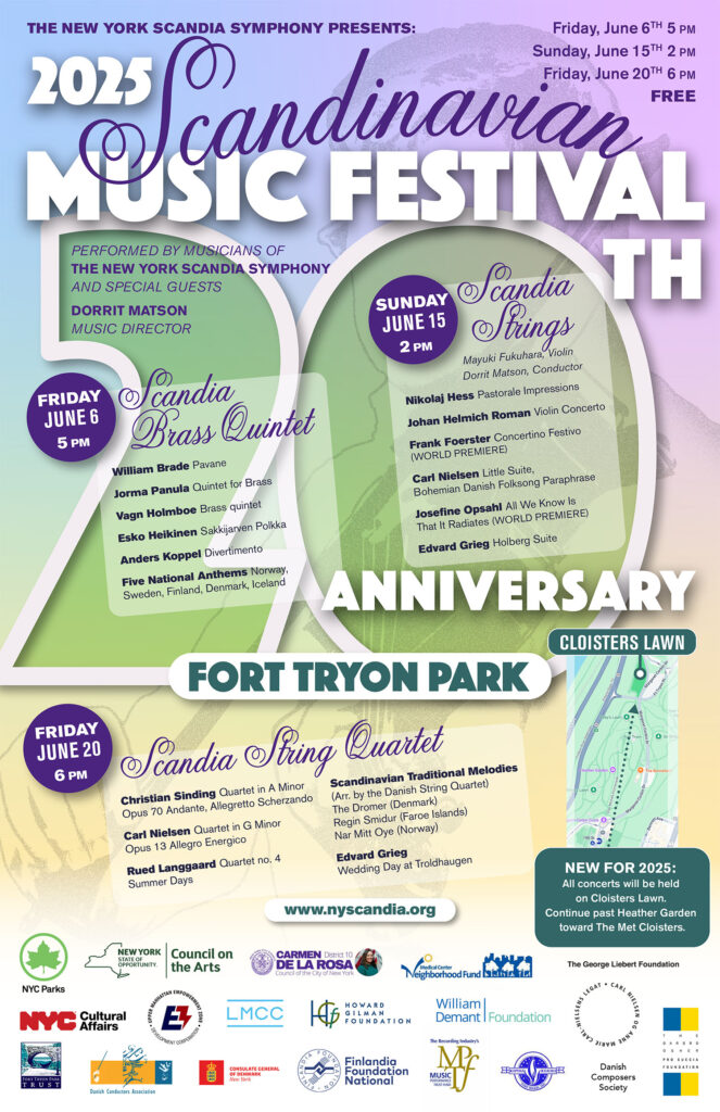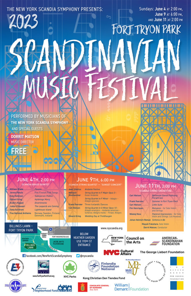 The Scandinavian Music Festival in Fort Tryon Park, now in its 20th season, is a unique series of three outdoor summer concerts performed by musicians of the Scandia Symphony and guest artists. The performances are all free of charge and will take place on Cloisters Lawn in Fort Tryon Park. This natural and scenic performance space within walking distance of Washington Heights and Inwood is a beautiful and inspiring setting for listeners and musicians alike. Events are planned for three dates in June 2025.