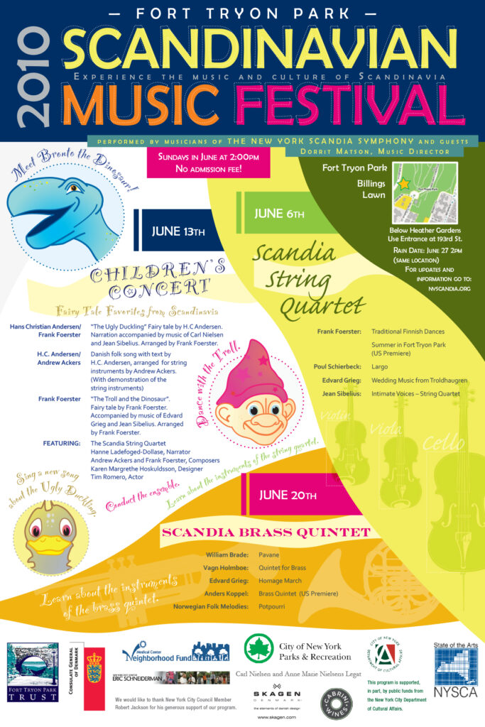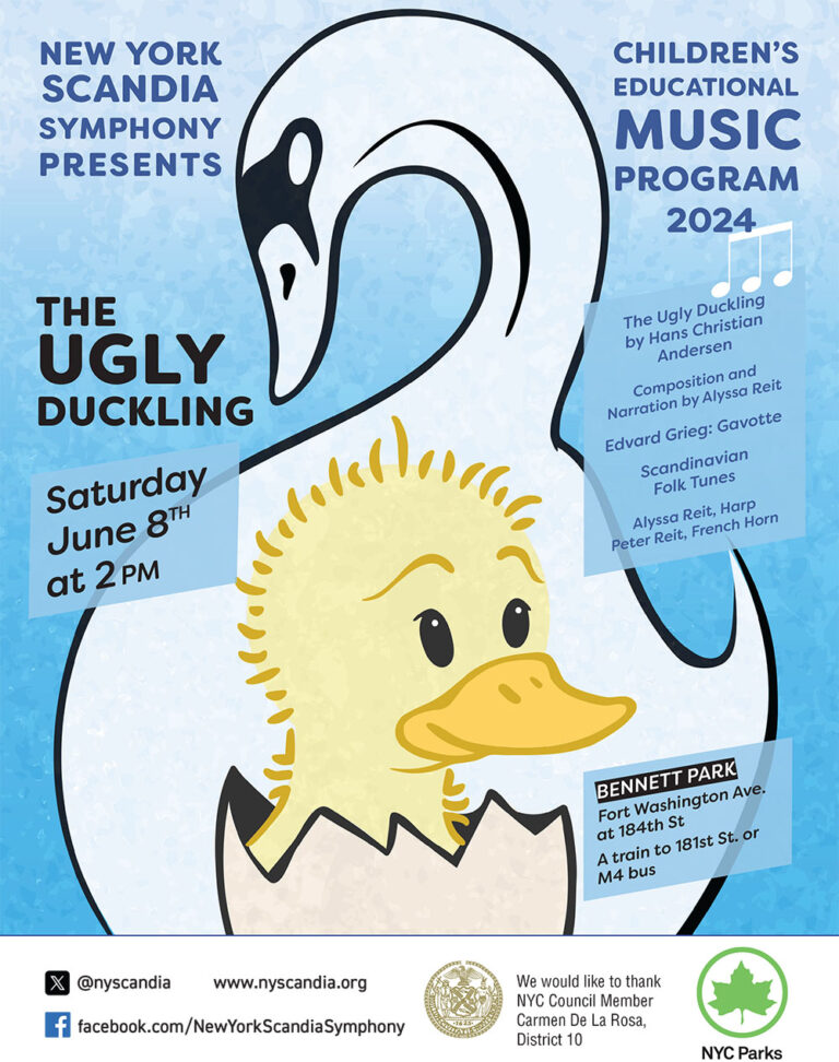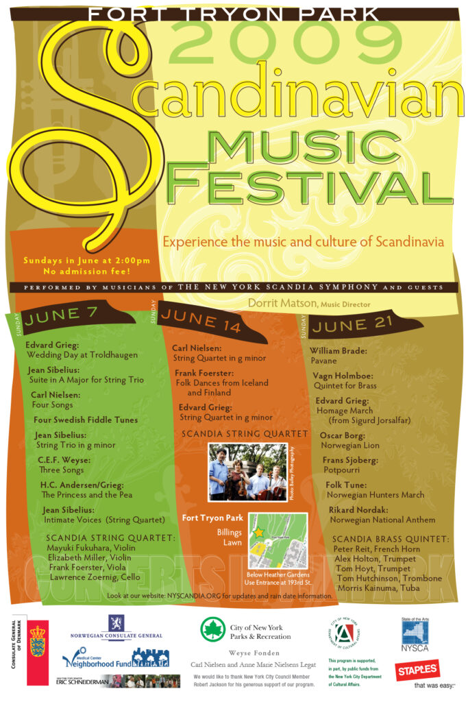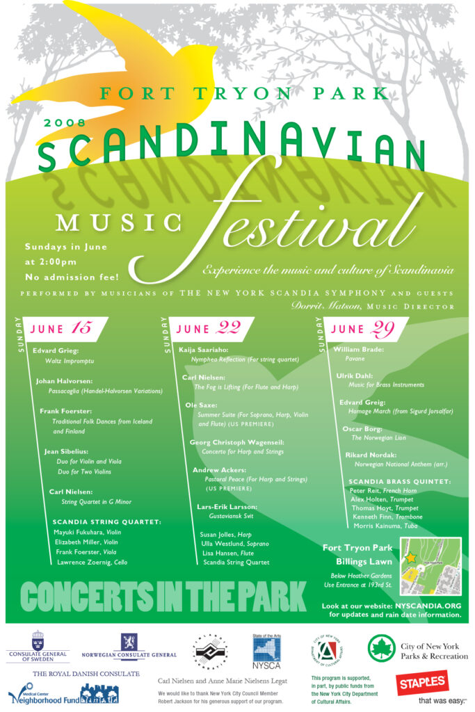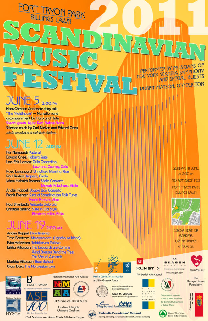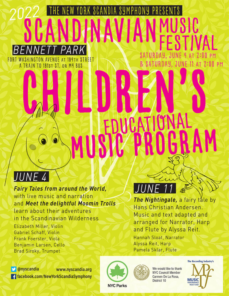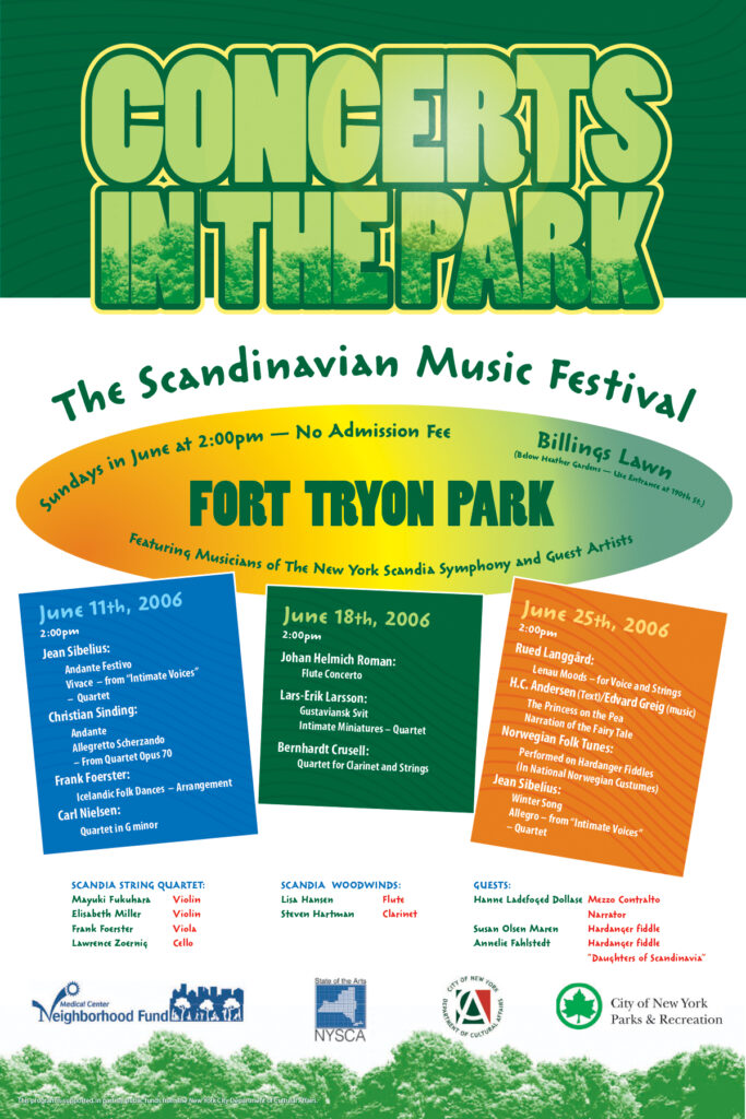 The Scandinavian Music Festival in Fort Tryon Park, now in its 20th season, is a unique series of three outdoor summer concerts performed by musicians of the Scandia Symphony and guest artists. The performances are all free of charge and will take place on Cloisters Lawn in Fort Tryon Park. This natural and scenic performance space within walking distance of Washington Heights and Inwood is a beautiful and inspiring setting for listeners and musicians alike. Events are planned for three dates in June 2025.